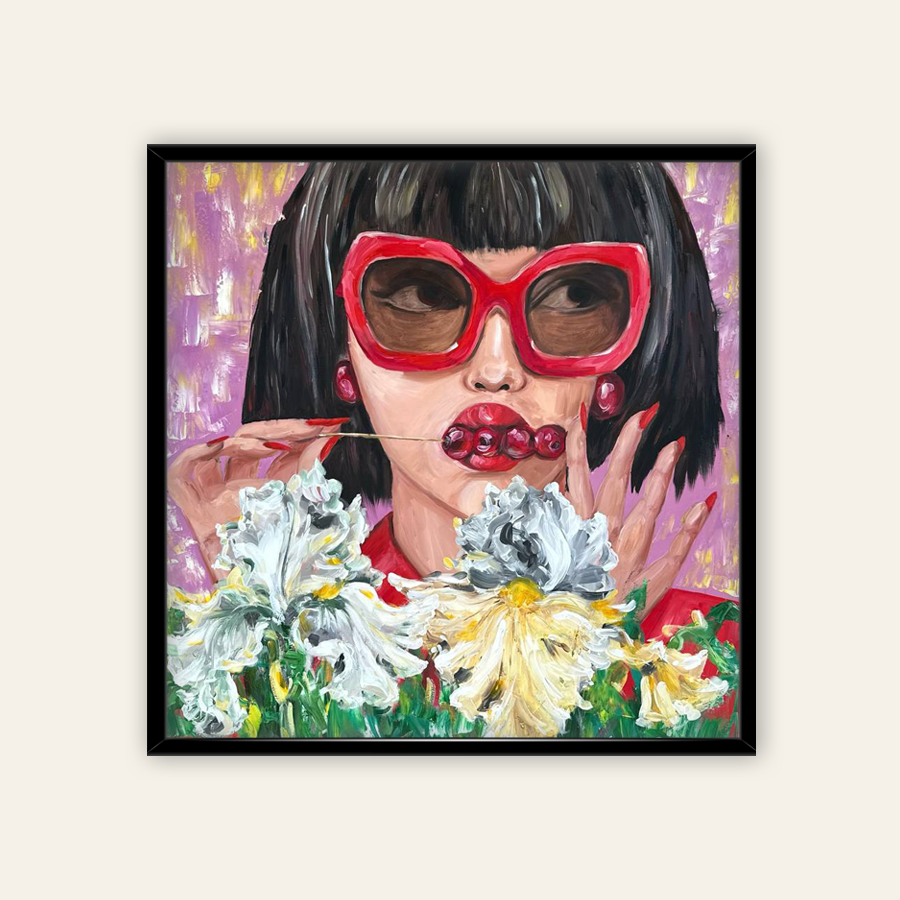 Aliejinis portretas vaizduoja merginą su raudonais patamsintais akiniais ir kare kirpimu. Ji grakščiai laiko pagaliuką su keturiomis vyšniomis ir vieną iš jų nusiima burna. Ploni pirštai su raudonu manikiūru sustiprina gestų jausmingumą. Pirmajame plane — prabangūs baltųjų vilkdalgių žiedai, suteikiantys kompozicijai ryškų kontrastą ir rafinuotą nuotaiką.