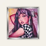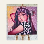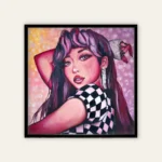Šis paveikslas – tai modernus, emocionalus moters portretas, perteikiantis drąsą, laisvę ir saviraišką. Ryškūs rožiniai, violetiniai ir šilti geltoni tonai sukuria dinamišką, švytinčią atmosferą, o kontrastingi raštai ir detalės suteikia kūriniui šiuolaikiško charakterio.