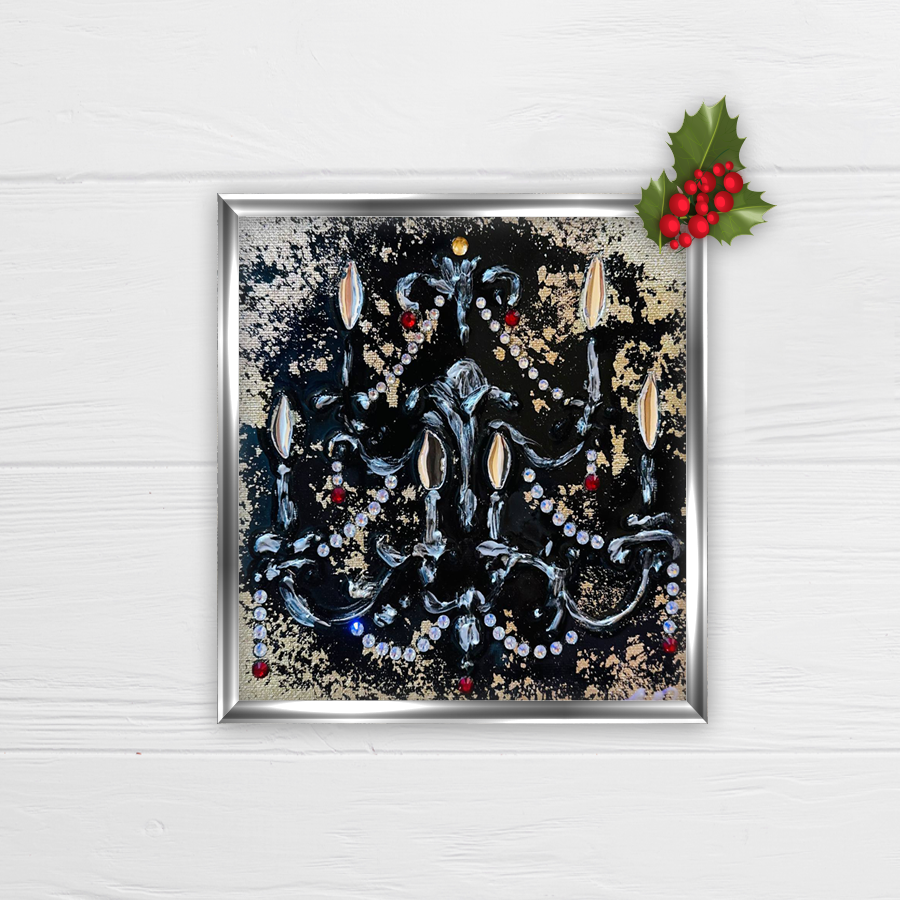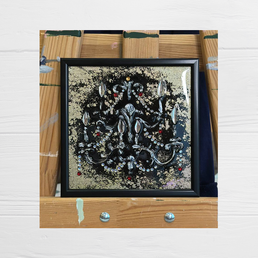 Paveikslas paverčia interjerą prabangos, šviesos ir meninio spindesio erdve. Centre – liustra, puošta žėrinčiais Swarovski kristalais ir kruopščiai išpjautais veidrodiniais elementais, kurie atspindi šviesą iš skirtingų kampų, kurdami daugiabriaunį spindesį. Epoksidinė derva suteikia kompozicijai gilumo ir tūrio, išryškindama kiekvieną lenktį, briauną ir tekstūrinį darbo elementą.