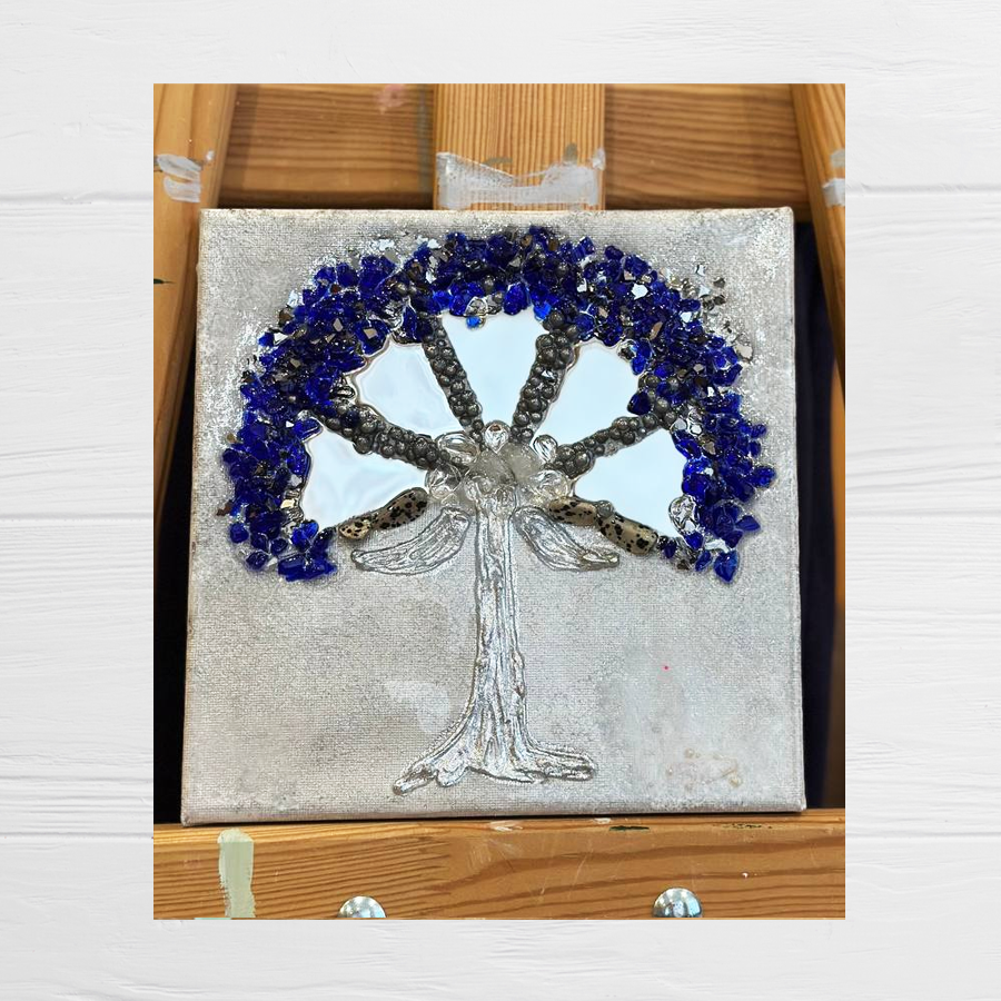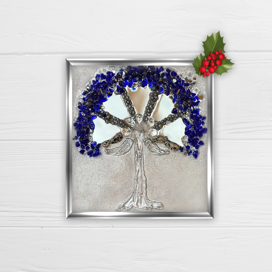 Tekstūrinis paveikslas „Norų medis“ – Atidarykite rankų darbo meno pasaulį su miniatiūriniu paveikslu „Sidabrinis medis“ – unikaliu dekoratyviniu akcentu, sukurtu su ypatinga meile ir dėmesiu kiekvienai detalei. Kompozicijos centre – grakštus, sidabru švytintis medis, kurio elementai rankomis išpjauti iš veidrodinės medžiagos. Veidrodiniai fragmentai gražiai atspindi šviesą, suteikdami medžiui gyvumo ir lengvo mirgėjimo efektą. Fonas ir tūris kuriami natūraliomis medžiagomis: stiklo trupiniais, suteikiančiais tekstūros ir šviesos žaismo; kalnų krištolu, dar labiau pabrėžiančiu kompozicijos tyrumą ir spindesį; ultramarino spalvos stiklo trupiniais, sukuriančiais gilų, kilnią nakties dangaus atspalvį.