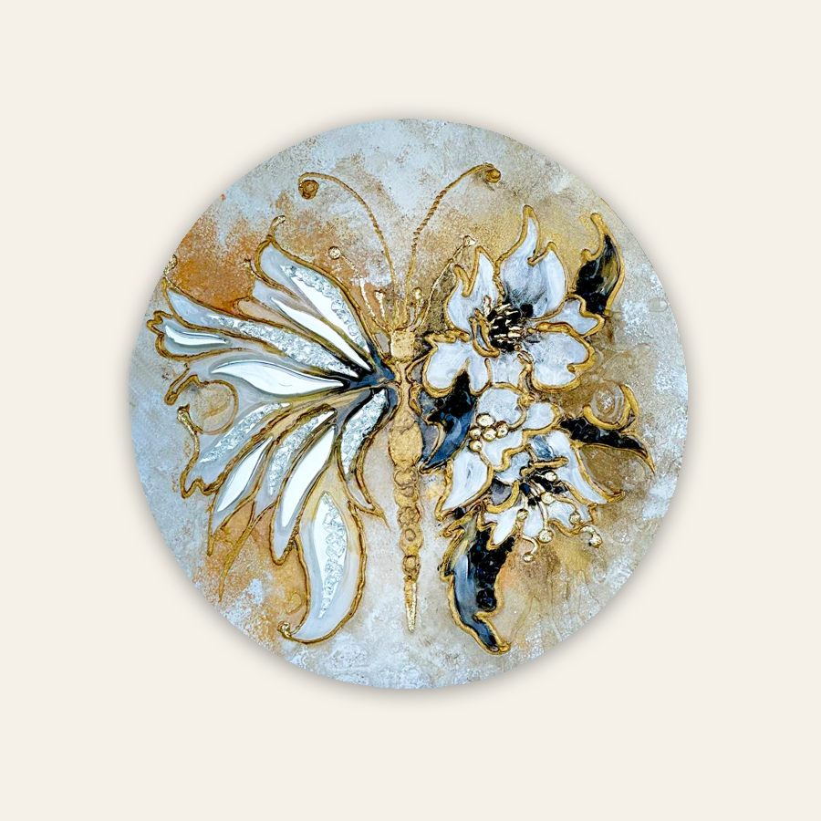 Drugelio sparną formuoja išdėstytos švelniai rožinės gėlės simbolizuoja moteriškąją pradą, meilę, švelnumą ir atsinaujinimą. Rožinė spalva veikia kaip ramybės ir vidinės pusiausvyros akcentas, o kartu su kristalais ir veidrodiniu spindesiu kuria harmoniją tarp materijos ir šviesos. Visa kompozicija padengta skaidria, aukštos kokybės epoksidine derva, kuri suteikia darbui gylio, sukuria stiklo lygumo efektą ir leidžia spalvoms atsiskleisti dar intensyviau.