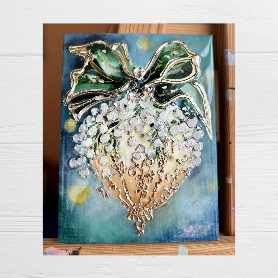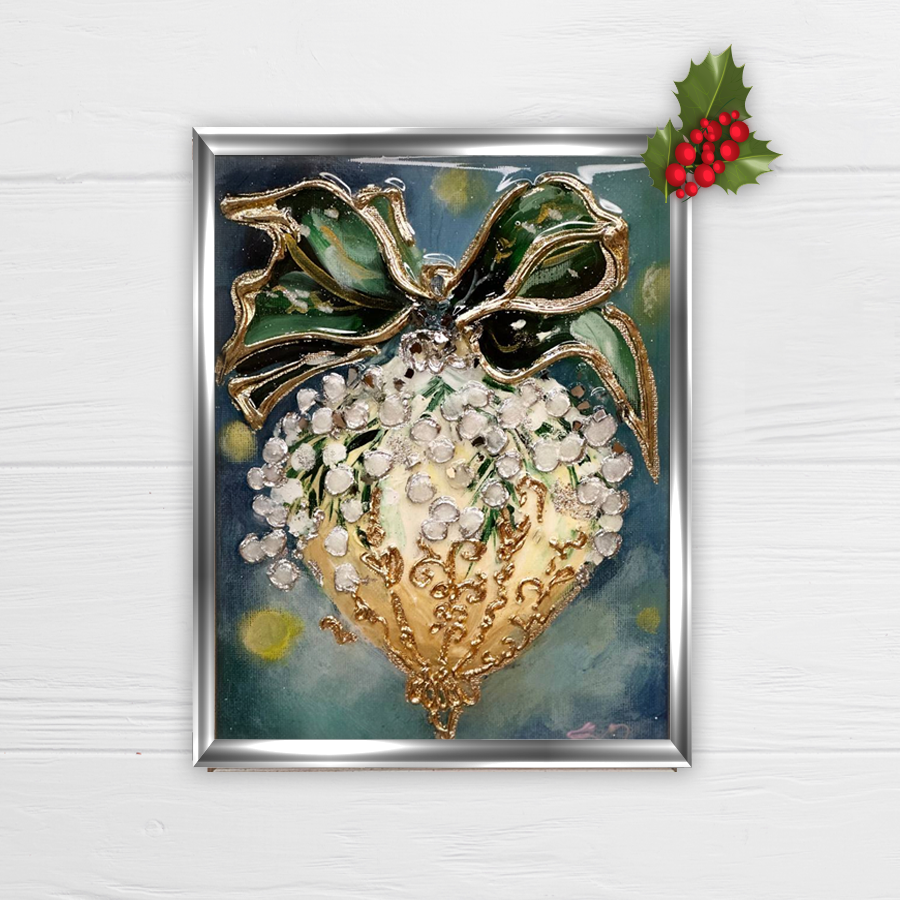 Šis paveikslas paverčia šventinę eglutės žaisliuką tikru meno kūriniu. Jame pavaizduotas tekstūrinis žaisliukas su smaragdinės spalvos kaspinu, auksine potale ir subtiliais perlo elementais, suteikiančiais prabangų spindesį. Visi dekoratyviniai elementai padengti epoksidine derva, kuri suteikia paviršiui veidrodinį blizgesį ir gilumą. Kiekviena detalė kruopščiai apgalvota, pabrėžiant faktūrą ir šventinę eleganciją. Paveikslas tarsi įkvepia šventinę nuotaiką ir tampa stilingu interjero akcentu. Tai puikus pasirinkimas tiems, kurie vertina meninę unikalumą ir rafinuotas dekoratyvines detales. Ideali dovana arba namų puošmena šventiniam sezonui.