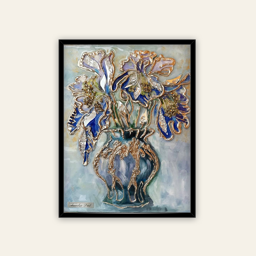 Prabangus faktūrinis paveikslas su mėlynais irisais vazoje, sukurtas naudojant tekstūrinę pastą, šampano spalvos potalę ir veidrodžio elementus, dekoruotus kalnų krištolu. Skaidri epoksidinė derva suteikia gylio, stiklinio blizgesio ir išryškina reljefinius gėlių kontūrus.