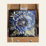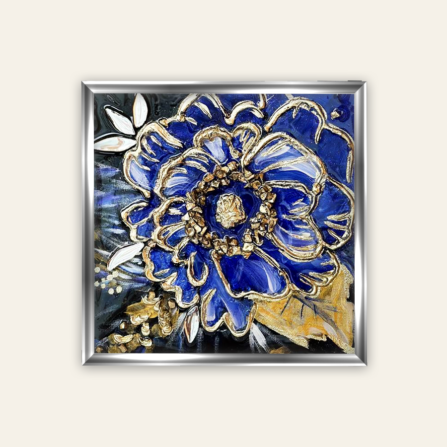 Miniatiūrinis paveikslas su ultramarino spalvos žiedu ant juodo fono, kurio kontūras sukurtas tekstūrine pasta ir dekoruotas auksine potale. Žiedo vidurys išryškintas auksine kruopstyte, paveikslas papildytas metalines spalvos dažais nutapytu lapu ir nedideliais veidrodiniais elementais migdolu forma. Visas paviršius užlietas epoksidine derva, suteikiant stiklinį blizgesį ir gylį. Ideali meninė dekoracija interjerui ar dovana.